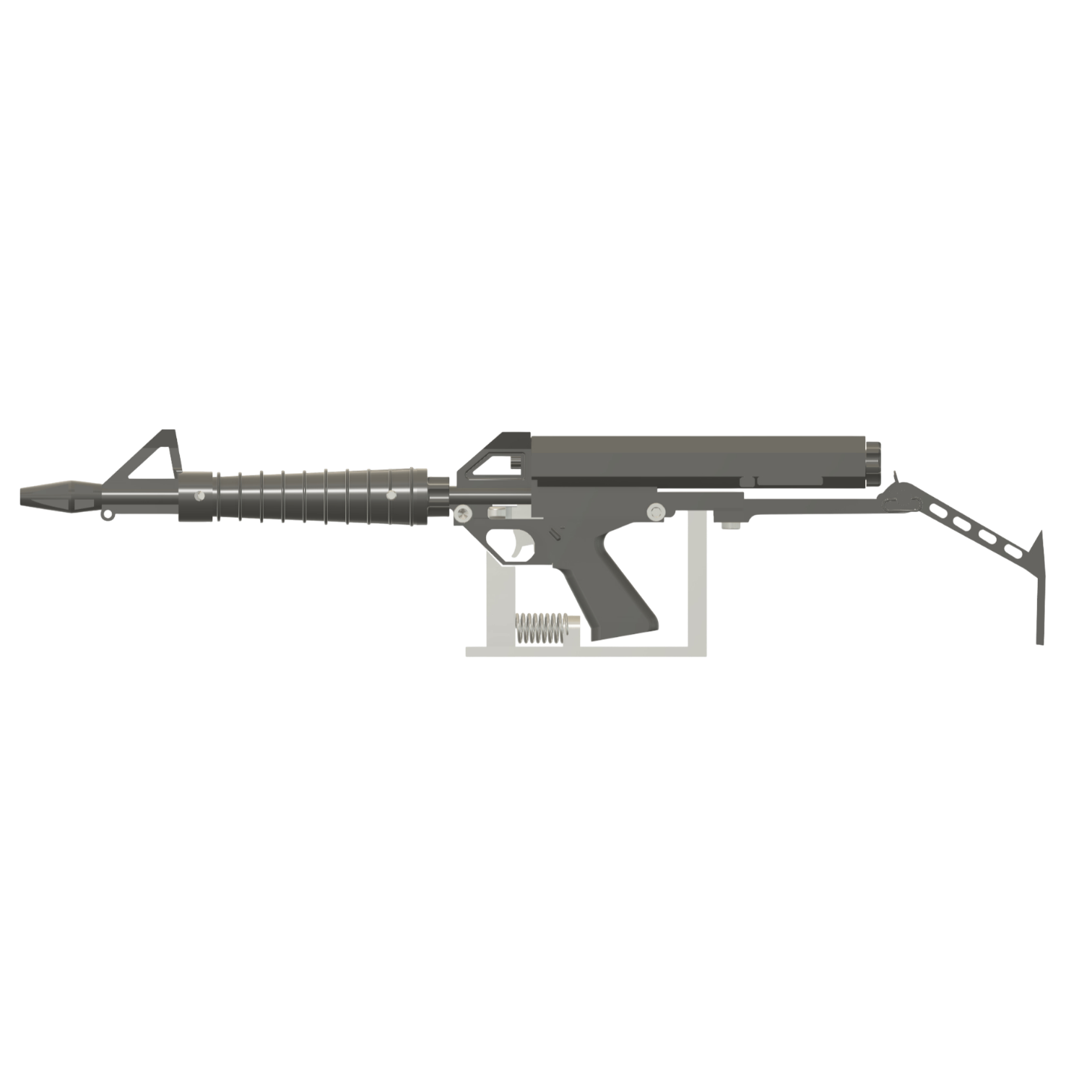 — Brutalist lower and fore flow — sculpted planes channel the eye along the helical magazine.